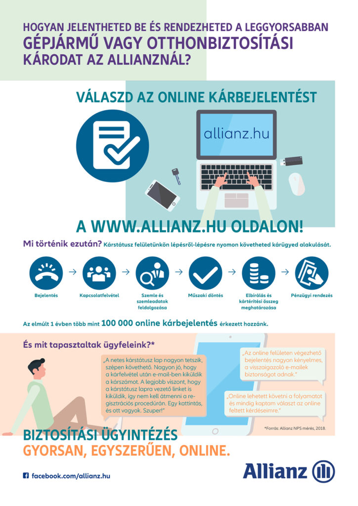 Az online kárrendezés a gépjármű és lakásbiztosítások esetében könnyíti meg az Allianz ügyfeleinek dolgát, akik az elmúlt 1 évben több mint 100 ezer esetben jelentettek be kárt az allianz.hu oldalon keresztül. Az online bejelentést követően az Allianz ügyfelei e-mailen kapják meg az elérhetőséget személyre szóló kárstátusz lapjukhoz, ahol a nap 24 órájában bármikor megnézhetik kárügyük alakulását, illetve iratokat tölthetnek fel a gyorsabb ügyintézés érdekében.