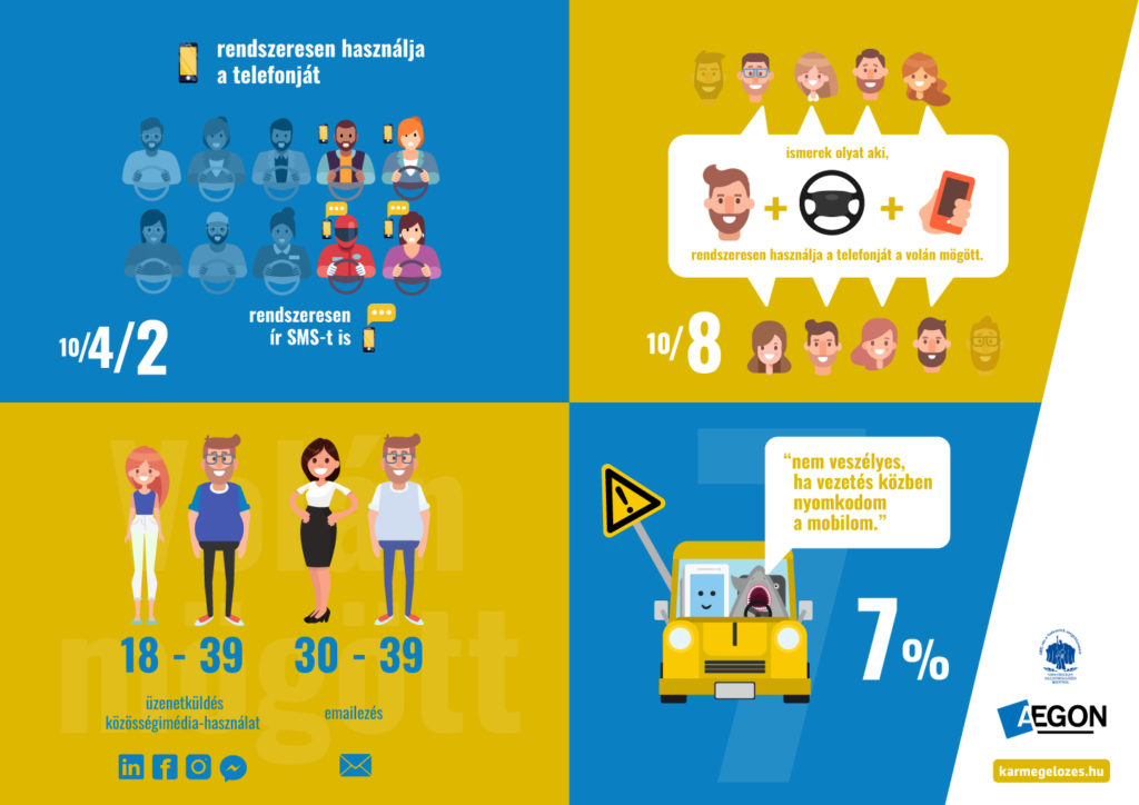 Tízből négyen használják az okostelefonjukat vezetés közben, közülük pedig minden ötödik ember üzeneteket és közösségi médiás bejegyzéseket is szokott írni az autóban – a többi közt ez derül ki az Aegon reprezentatív felméréséből. A kutatás szerint a sofőrök azt sem tudják helyesen, mit tilos és mit szabad. A vezetés közbeni mobilhasználat sokakat veszélyeztető jelenség, gyakorlatilag a 21. század ittas vezetése. Egy új típusú „függőség”, amely a jelenlegi adatok szerint még veszélyesebbé is válhat annál. A jogsértés visszaszorítása érdekében az Aegon és az ORFK figyelemfelhívó kampánysorozatot indít, humoros ismeretterjesztő videókkal és VR-technológiával.
