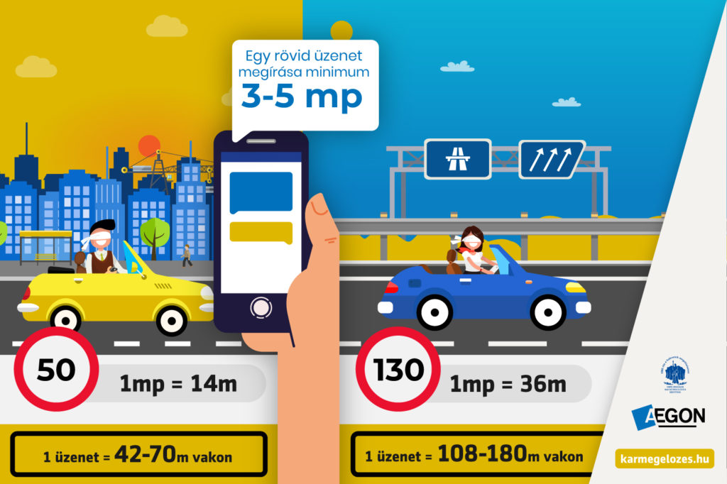 • Az okostelefon hasznos segítőtársa a modern embernek, de veszélyforrás, ha vezetés közben használjuk. Az autópályán 130 kilométeres sebességgel haladó autó 36 métert tesz meg egyetlen másodperc alatt, a városi közlekedés tempójában 14 métert – vagyis ennyit vezetünk vakon, ha a telefonra figyelünk, és ez az a távolság, ameddig nem tudunk reagálni a forgalmi helyzetekre.  Mindannyiunk érdeke, hogy a sofőrök magukra és egymásra is vigyázzanak, és biztonságban odaérjenek úticéljukra – mondja az Aegon Magyarország Általános Biztosító Zrt. vezérigazgató-helyettese, Szombat Tamás.