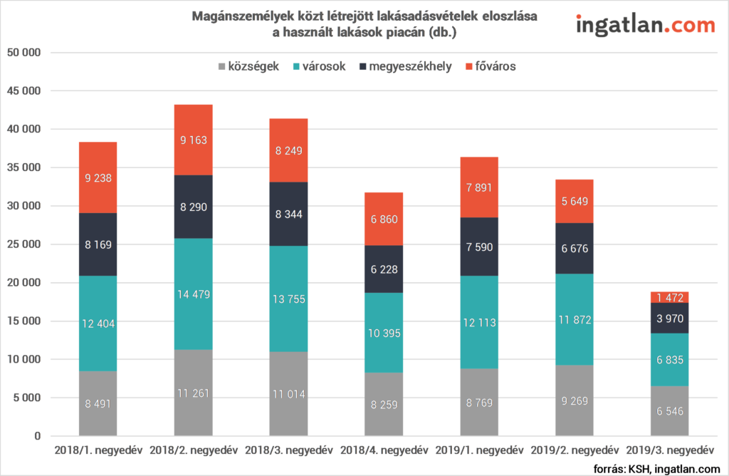 A legdurvább csökkenés a fővárosi használt lakások piacán látható: a múlt év harmadik negyedében mindössze 1472 ingatlant került új tulajdonoshoz, ami 82 százalékos zuhanást jelent éves összevetésben. A megyeszékhelyeken 52 százalékkal 3970-re csökkent az adásvételek száma, a nagyobb vidéki városokban 6835 tranzakció történt, ez 50 százalékos hanyatlást jelent az előzetes adatok szerint.