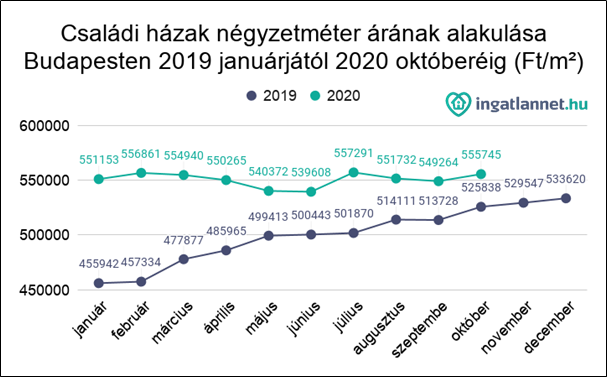 A 2019-es évet figyelve látszik mekkora mértékben növekedtek az ingatlanárak, folyamatos növekedés volt jelen egészen decemberig. 456 ezer Ft/nm-es árakon indult az év és decemberre egészen 534 ezer Ft/nm-ig növekedett. Egy esztendő alatt tehát a budapesti családi házak árai 78 ezer forinttal növekedtek négyzetméterenként.