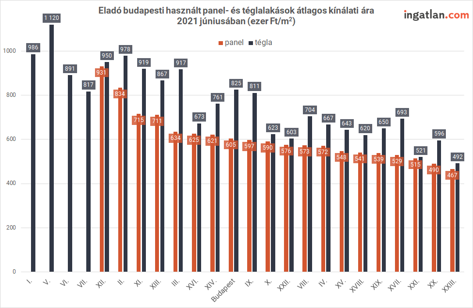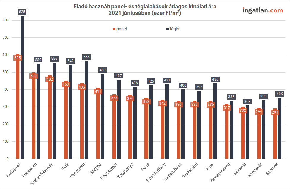 Az ingatlan.com elemzése szerint június közepén a budapesti panellakások átlagos négyzetméterára a kínálati piacon 605 ezer forint volt, ami 6,1 százalékos emelkedésnek felel meg éves szinten. A téglaépítésű lakások négyzetméterára mérsékeltebben, kevesebb mint 4 százalékkal 825 ezer forintra nőtt.