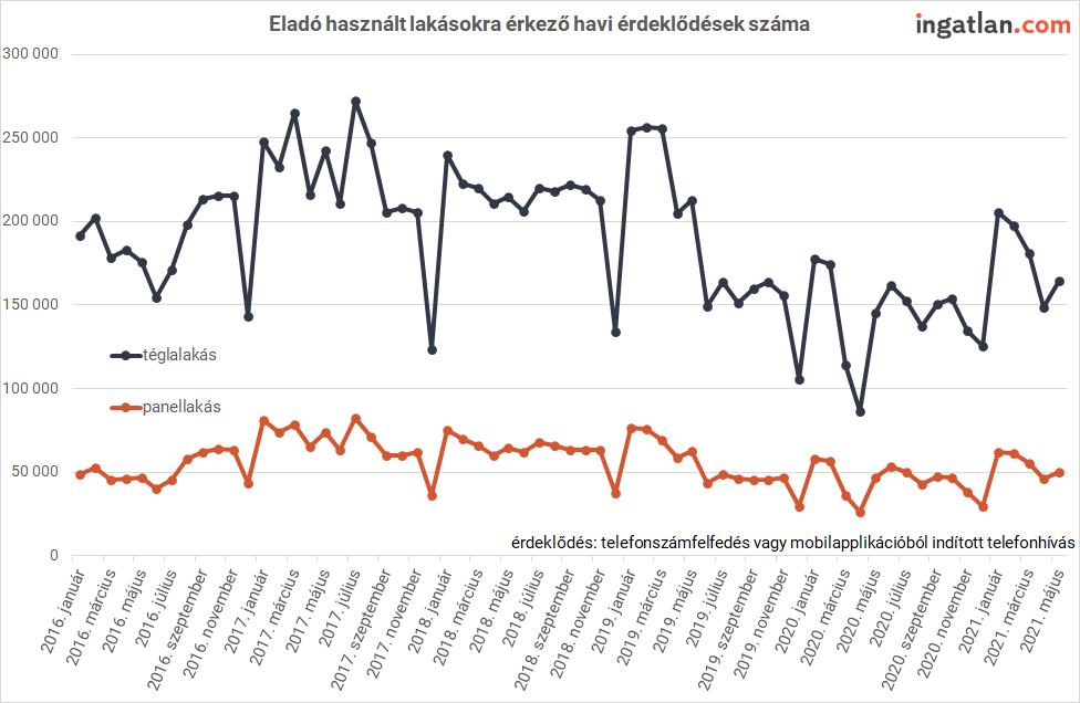 Idén januártól május végéig országosan havonta átlagosan 55 ezer érdeklődés történt a panellakások iránt, ami meghaladja a járvány előtti – 2019 egészére vonatkozó – havi átlagot. Közben a téglaépítésűeknél az teljes érdeklődés még nem lépte át a pandémiát megelőző szintet, igaz, már nagyon közel van hozzá.