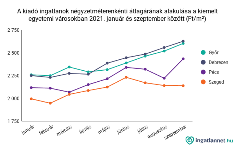 A jelenléti oktatás újraindításával párhuzamosan akár kétszámjegyű drágulás is lehet az egyetemi városokban. A nyári hónapok alatt a bérleti díjak több egyetemvárosban – köztük Debrecenben, Szegeden, Győrben és Pécsett is – nagy mértékben nőttek, átlagosan 4,3%-kal. A legnagyobb mértékben Győrben, közel 10%-kal nőttek az albérletárak három hónap alatt, augusztusban átlagosan már 130 ezer forint volt egy havi lakbér. Debrecenben 7,2%-kal került többe augusztusban a bérelhető lakások négyzetmétere, mint májusban. A vizsgált egyetemi városok közül Pécsett és Szegeden stagnáltak a bérleti díjak az említett időszakban.